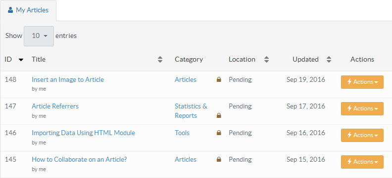 Estimated Reading Time: 2 MinutesUsers can expand "My Articles" link under Articles section of left navigation bar to view their own articles to update them. ’My Articles’ page will be displayed which contain several columns as shown in the figure below: