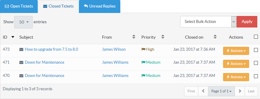 Click on Closed Tickets tab to view closed tickets. However, you can also access the closed tickets directly from left navigation bar by Clicking ’Closed’ link under Tickets section. The closed tickets are displayed as shown below: