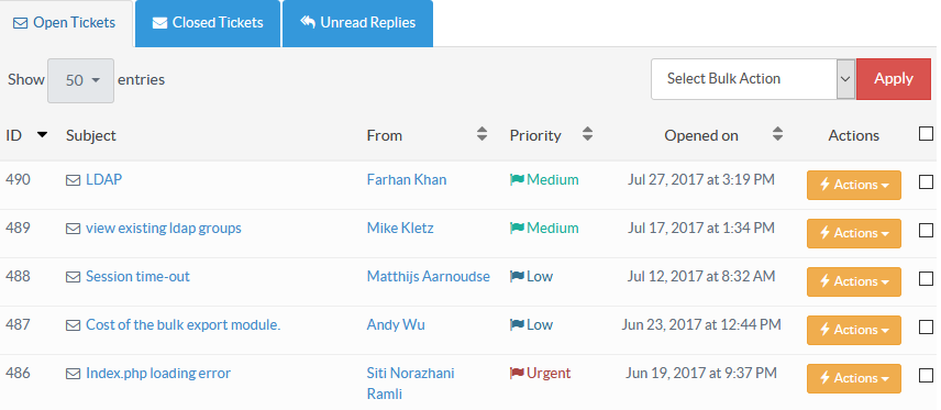 - Opened on/ Closed on: This column displays the date and time when the ticket was opened or closed. Opened date and time is when a question was submitted by the user and column is visible on open tickets page only. Closed date is when ticket or question submitted was closed by the admin user and column is displayed on the closed tickets page.