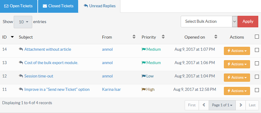 Click on Unread Replies tab to view the counter replies of users on their tickets. Moreover, you can also access this section directly from left navigation bar by Clicking ’Unread Replies’ link under Tickets section. This feature is only available in enterprise edition of knowledge base software.