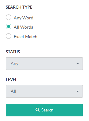 - Select a "Level" (See: PHPKB Users ) to search for specific type of user. By default, All is selected which searches users irrespective of their level.