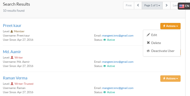 - Result screen displays user details such as name, username, level, email address and status. You can click on Actions button to edit, delete or deactivate the user.
