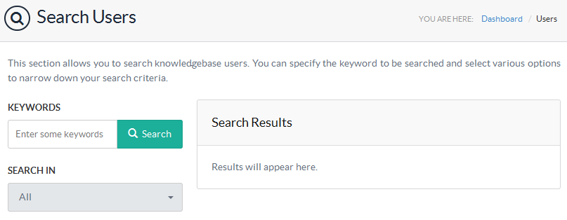 Estimated Reading Time: 1 MinutesPHPKB has a feature to filter knowledge base users by specifying parameters in the search form. Expand "Users" section in left navigation bar and click on "Search" link to open Search Users page as shown in the screenshot below: