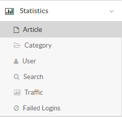 Statistics section is categorized into several subsections to provide in-depth statistics of various knowledge base components such as articles, categories, users, search traffic & failed login attempts. Reports are available in the form of interactive charts (for graphical analysis) as well as in tabular (print-friendly) formats. Superusers can click on "Statistics" section in the left navigation bar to view different reports.