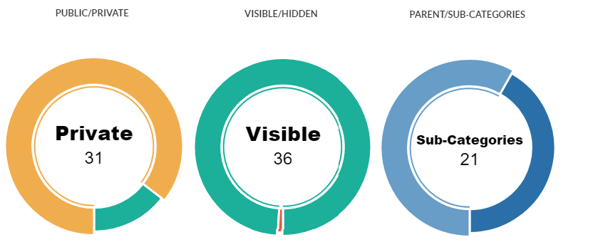 - Private/Public: This donut chart shows the count of private and public categories in the knowledge base. One portion of donut depicts the number of private categories and other portion shows the count of public categories. When you move the mouse pointer on the portion, the count value is displayed along with the type of category.