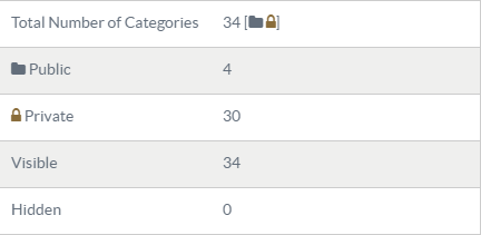 - Private: This field displays the count of the total number of private categories (visible and hidden) in the knowledge base.