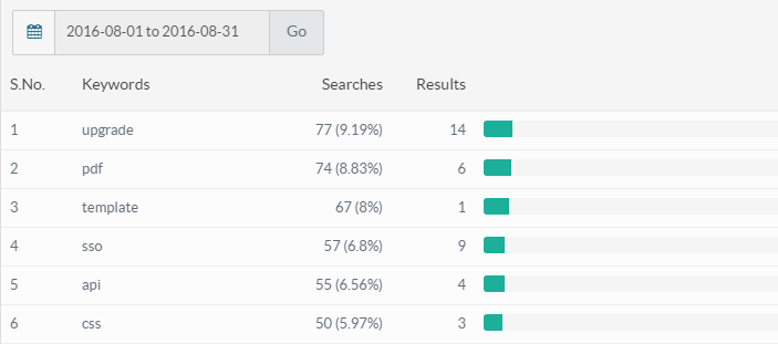 Click on "Failed" tab on this page to view failed searches. The page displays a list of terms or keywords for which knowledge base was not able to find any results. The table is arranged in descending order according to the number of times terms have been searched.