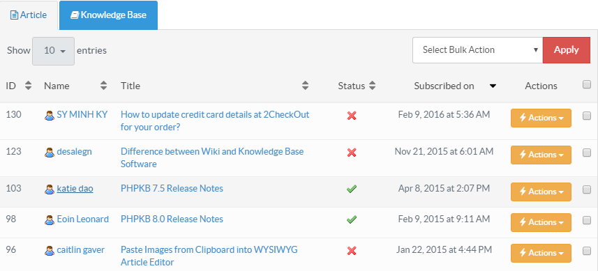 - This section consists of two tabs for Article Subscribers and KB Subscribers. By default Article subscribers are displayed but you can click on ’Knowledge Base’ tab to view KB Subscribers.