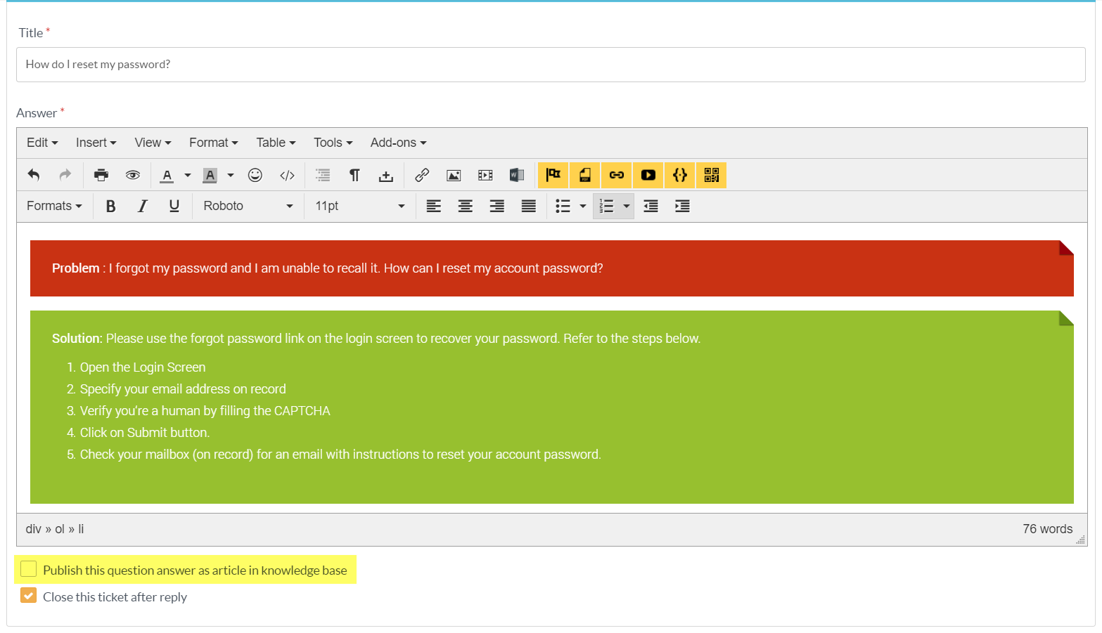 While creating a ticket-based article (by converting ticket reply as an article) in the knowledge base, sometimes agents overlook searching for the same in the knowledge base. So, before creating a new article in the knowledge base, the agent should first search the knowledge base by important keywords to see if there is any record of fixing the problem with the same title. If no matching results are found, only then a new article should be written. If there is already an article with that solution, then it should be updated, with a note, acknowledging the author of the original entry.