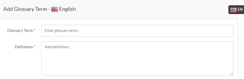 - The language under which glossary term will be created is displayed with panel heading, as English is displayed in above screenshot. This feature is available only in ML edition and has no role in the non-ML editions of software.