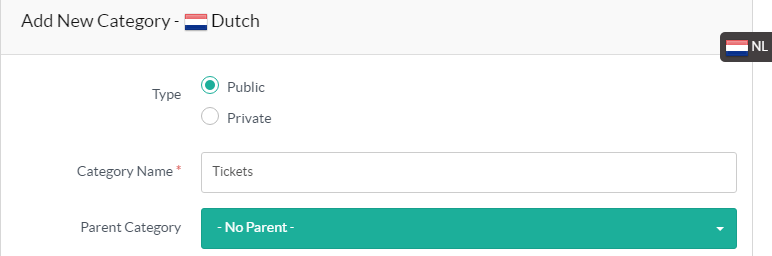 - In ML editions, the language in which the category will be created is displayed with panel heading. As an example, in the screenshot below, Dutch is displayed but you can change the language from language drop-down available on the right side of the page. (Refer article Admin Control Panel Interfacefor more details).