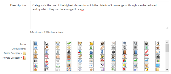 - You can select an icon for the new category from the list of available options (feature available only in enterprise editions). By default, folder icon