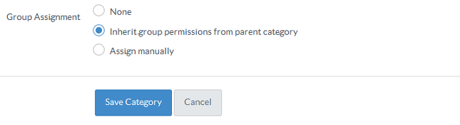 If you wish to assign the new category to an existing USER GROUP, select either ’Inherit group permissions from parent category’ option or ’Assign manually’ option in GROUP ASSIGNMENT. Inherit group permissions from parent category option will assign the category to all those groups to which its parent is associated. Assign manually will display the list of groups and you can choose the groups as per your requirement. - Click on "Save Category" button to save the category in the knowledge base.