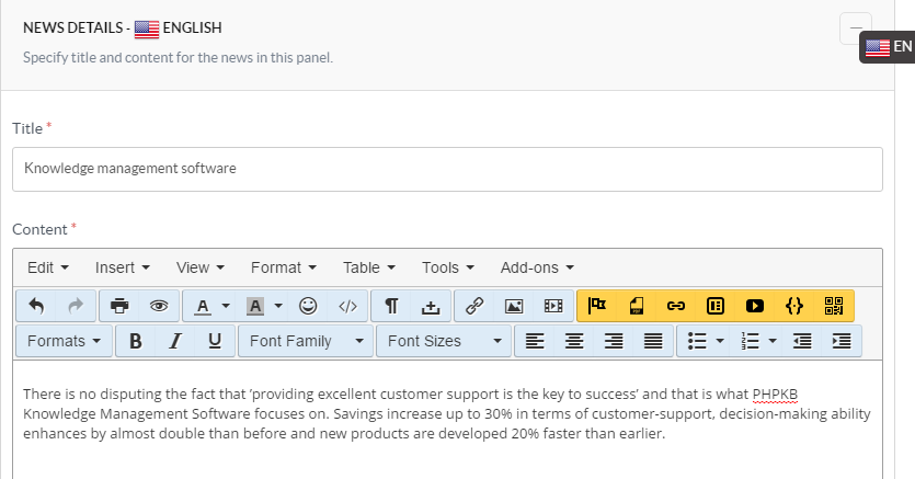 - Enter the news title in "Title" field. The title is heading for the news. Multiple news with the same heading is not allowed in the knowledge base.