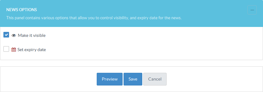 - In "News Options" section, you can set the visibility and expiry date for the news. Marked checkbox of Visibility option makes it visible to the readers. You can specify the date up to when news will be visible to front-end users through "Set Expiry Date" option.
