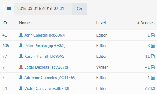 Estimated Reading Time: 1 MinutesThe report displays a list of contributors along with the number of articles they have posted in the knowledge base. A contributor can be a Superuser, an Editor, a Writer, or a Writer-trusted. Expand "Statistics" section in left navigation bar and click on "Users" link. Users statistics page will display; click on "Contributors" tab to view the details of contributors and their contributions.