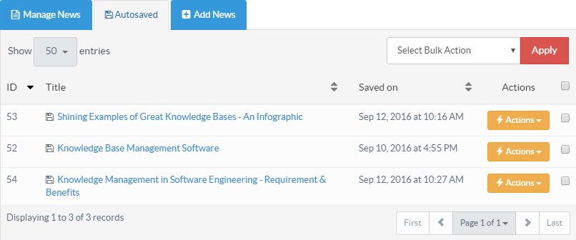 - Saved On: This column displays date and time when the news was added in autosaved drafts.