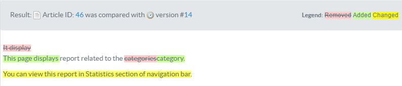 For example, in the screenshot above, It displays has been replaced by This page displays that is why It displays has been marked in pink to show removed text and This page displays in green to show newly added text. Legends on the right side of the page clearly define the meaning of words in different colors. - Plain Article Text: If you select this option, the result shown will be the comparison between contents of the article and the contents of selected version (Left Side) in the form of plain text. An example is shown below: