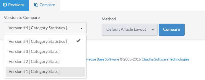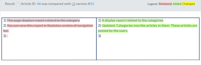 Estimated Reading Time: 2 MinutesArticle versions are automatically saved versions of an article in the knowledge base. Every time you update an article, the software creates the article revision that contains article details without the recent changes. You can manage and compare these revisions from Article Versions section. Comparison of these versions let you know what changes have been made and enables to take important decisions like reverting to the previous version. You can do the comparison between versions in "Version Comparison" page. This feature is available only in enterprise edition of PHPKB Software. Click Compare tab on ’Article Version’ page (Refer article Article Versions for more details) to view version comparison page.