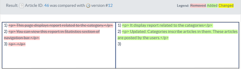 - HTML Source: If you select this option, the result shown will be a comparison between contents of the article and the contents of selected version (Left Side) of the article in the form of HTML Source even comparing the HTML tags. An example is shown below:
