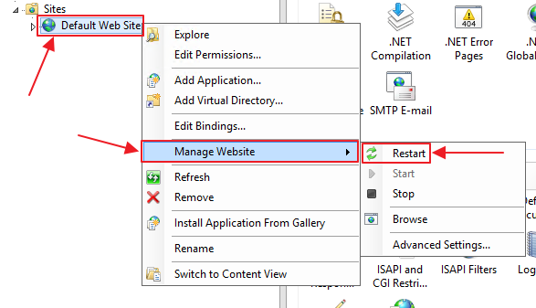 - Now, it would be moved to Enabled extensions list and then right click on your Web Site name (listed on the left side tree) then hover Manage Website and click Restart option (see image below).