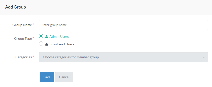 - Select categories in "Categories" drop-down. For group type ’Admin Users’, both public and private categories can be selected but for ’Front-end Users’ only private categories can be selected.