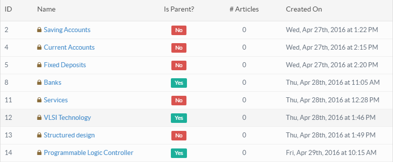 - Name: This column displays name of the category in the knowledge base. The lock icon in front of category name represents the private category. You can click on the name to view and manage this category under manage categories section.