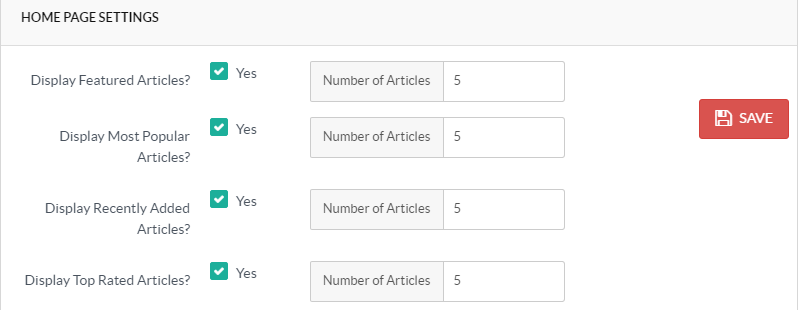 - Display Recently Added Articles?: Enable this option if you want to display the "Recently Added Articles" section on the home page of the front end. Number of Articles - Enter the number of recently added articles that you want to display.