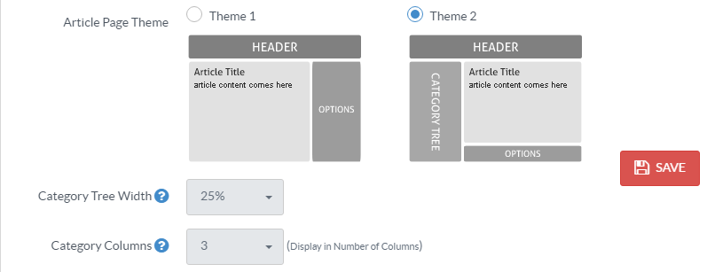 - Article Page Theme: Two themes are available for the orientation of the article page. Themes are designed to arrange the article parts like article title, article contents, category Tree, headings, article options at different locations.