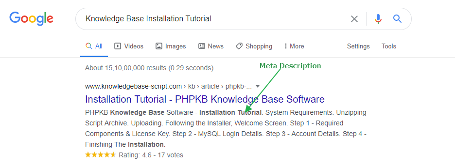 In a web page, meta description tags appear in <head> section. However, if you use PHPKB knowledge management software, you don’t need to dive into the HTML code since these platforms allow you to add/change the meta description, meta keywords, title tag, and more all through the form fields while creating/modifiying the knowledge base articles.