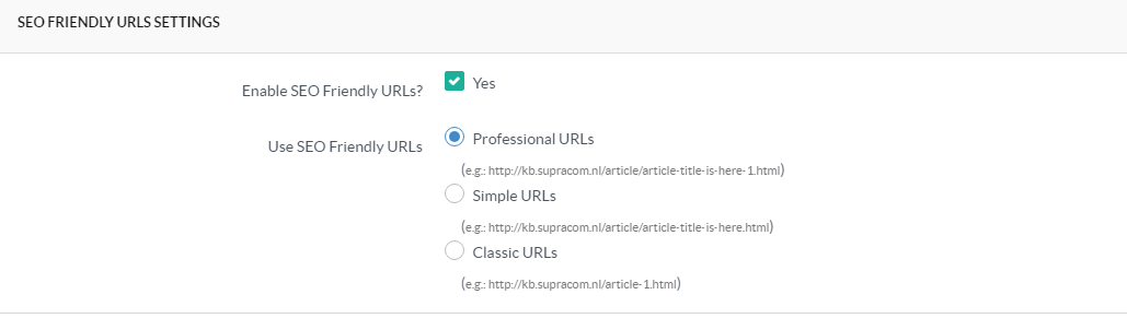 Estimated Reading Time: < 1 MinuteProblem: I have enabled SEO Friendly URLs setting in PHPKB (as shown below):
