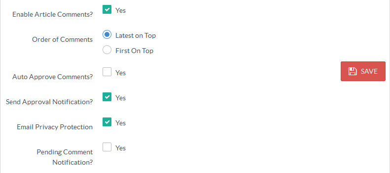- Pending Comment Notification?: If enabled, Superuser will receive a notification to approve a newly posted comment. The setting would be effective only when the Auto Approve Comments setting is disabled.