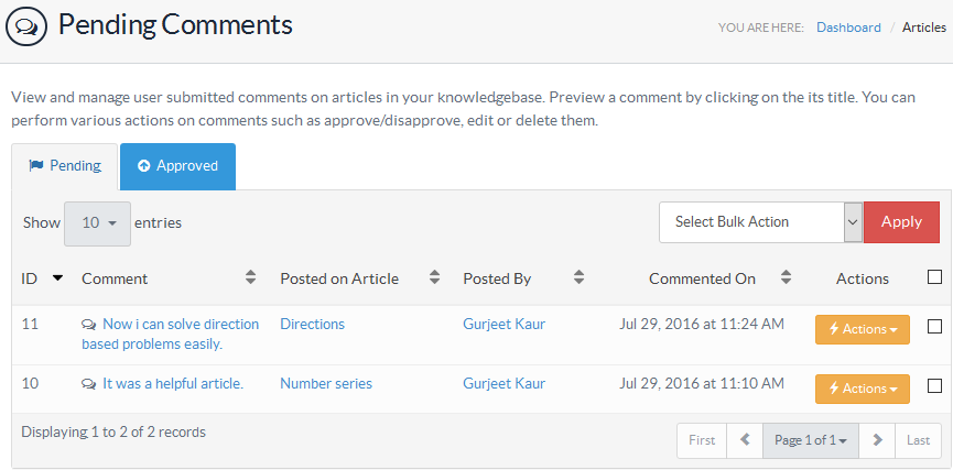 - Posted On Article: This column shows the title of an article on which the comment is posted. You can click on it to preview the article.