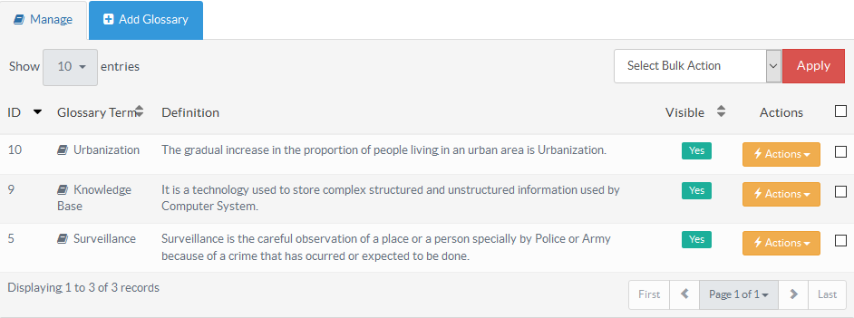 - You can perform the same action on more than one glossary term using "Select Bulk Action". For this, you need to mark the check boxes corresponding to the terms for which action is required and then select the desired action in select bulk action drop-down and click on "Apply" button.