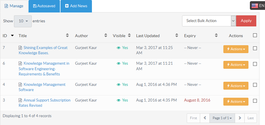 Estimated Reading Time: 2 MinutesSuperusers and Editors can manage News/ Announcements in the knowledge base. Click " Manage " link in " News " section of left navigation bar to open " Manage News " page. In ML editions, you can manage the news items posted under different languages by navigating through the language drop-down available on right side of the screen.