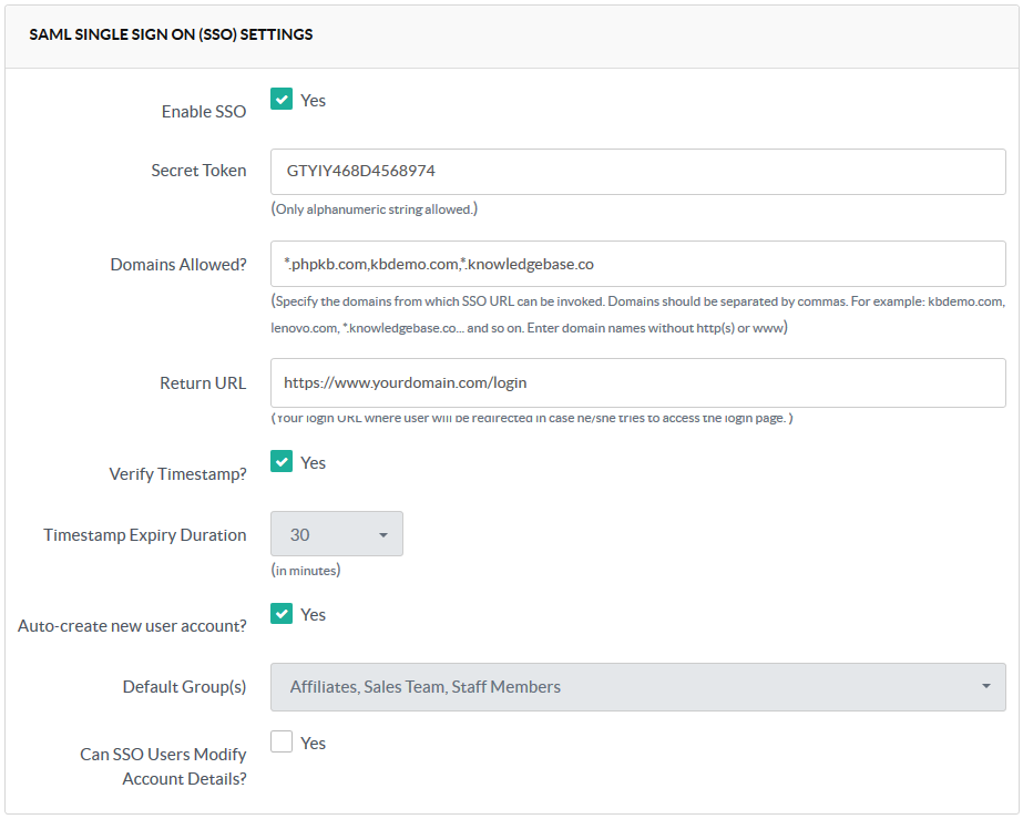 - Can SSO Users Modify Account Details: Enable this setting if you want that users created through SSO can change their email and password details in the knowledge base. By default, this setting is disabled.