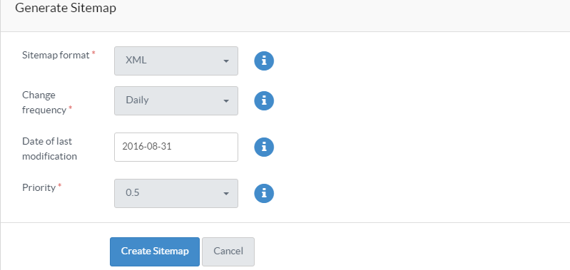 Expand the "Tools" section of the left navigation bar and click on the "Sitemap Generator" link to view Generate Sitemap screen as shown below: