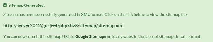 - Click the "Create Sitemap" button to generate the sitemap or you can click on the Cancel button to abandon the process. When the sitemap is successfully generated, it will display the following information: