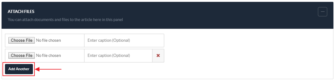 You can also attach external files / attachments (without going to Add/Edit Article pages) through Manage Articles > expand Actions button of any article and choose Attachments option from the drop-down list. You will see this [Add Another] similar option on Attachments page if you are attaching files this way directly.
