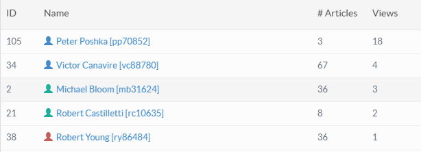 Views: This column displays the total number of views of all the articles of the author. The author having maximum views is listed on the top and the one with minimum views is displayed at the bottom.