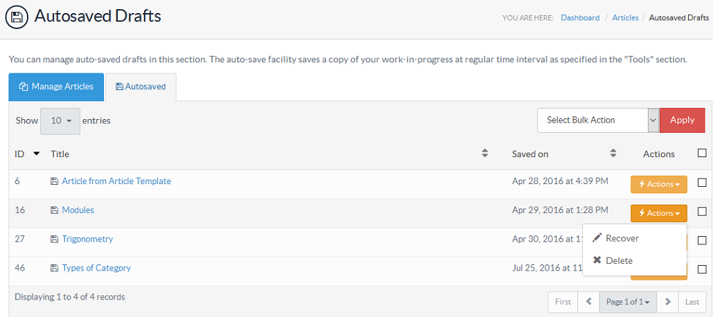 Recover - Click to resume writing the article. When you recover the article, you are redirected to "Add Articles" page with draft details auto-populated.