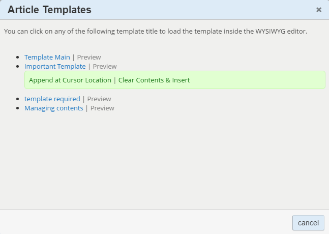 When you click on Article Template button, a dialog named Article Templates will be opened with the list of all the visible templates as shown in the screenshot below.