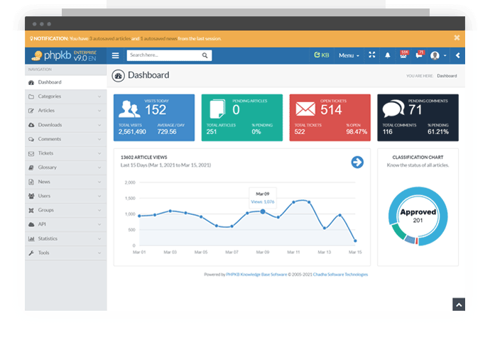 We believe in simplicity. We believe it's unnecessary for you to spend a ridiculous amount of time just to master a product that supposedly helps you do something as simple as organizing your knowledge in one place and serving your customers! With PHPKB, a knowledge base can be set up in under 10 minutes and it comes with an interface that looks neat and is super-easy to use.